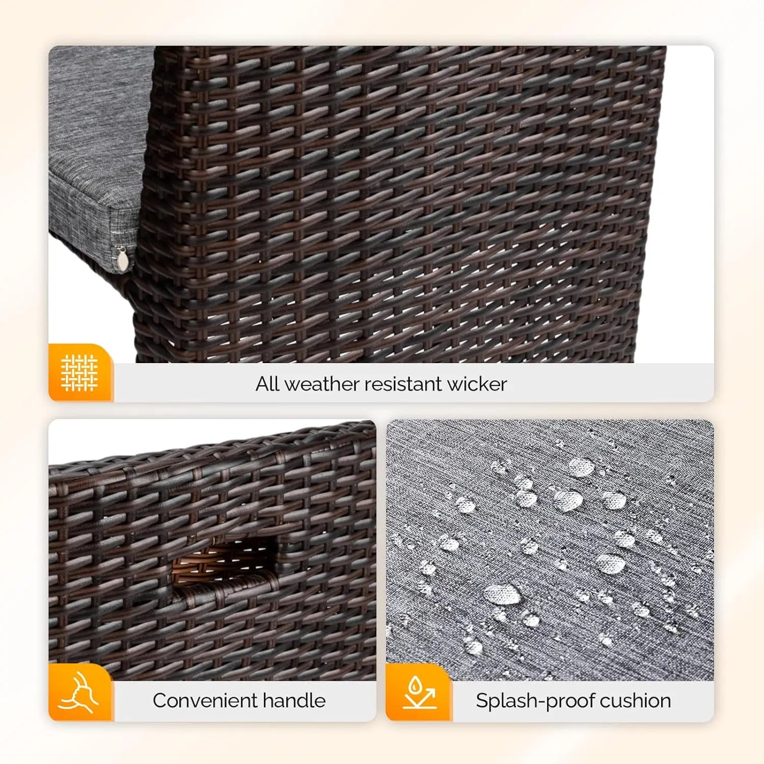 - [Comfort and convenience] Keep customer’s relaxation and coziness in mind. Rattan cushioned patio set comes with thicker cushions which ensures you getting full enjoyment. Water proof design save you from worrying about tipping. You can zip off the cushion cover and give it a machine wash