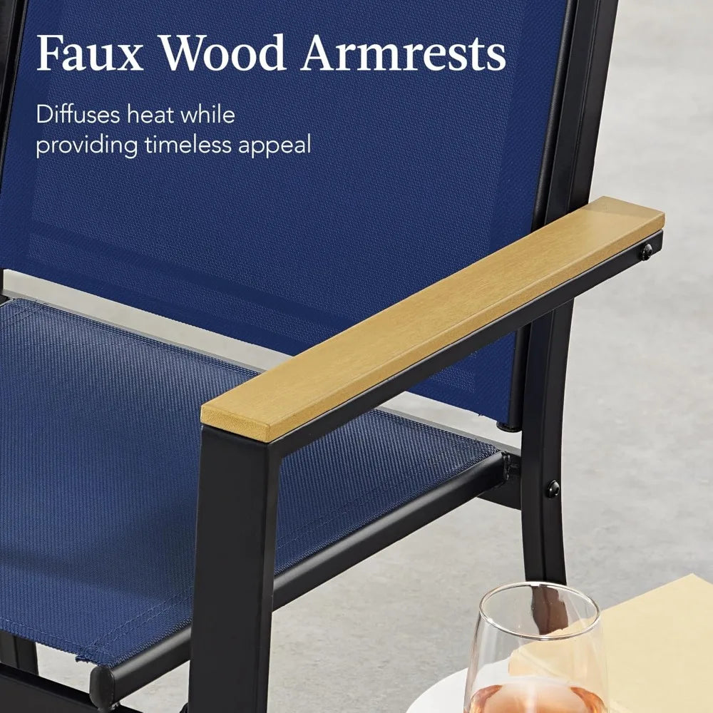 - FAUX WOOD ARMRESTS: Accent panels on the steel armrests help elevate the arms for a more relaxed posture and diffuse heat to prevent burns during full-sun conditions