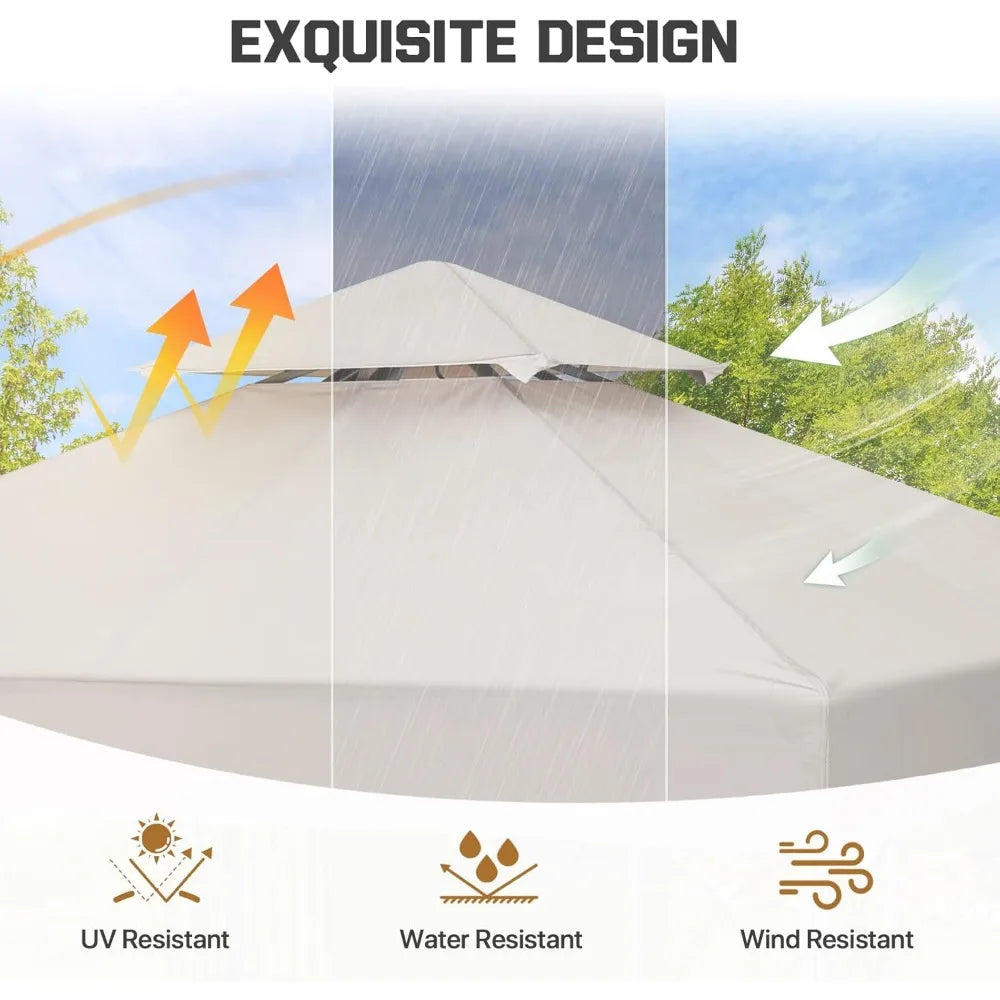 - ENHANCED ROOF VENTILATION: Crafted from 100% polyester fabric, the gazebo canopy is durable, water-resistant, and provides UV protection. The dual-layered roof design with built-in drainage holes ensures proper airflow, minimizes wind strain, and keeps debris at bay